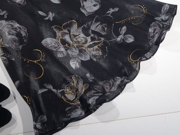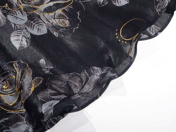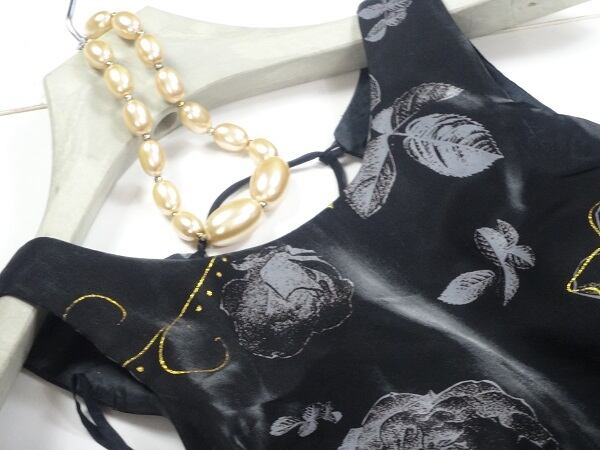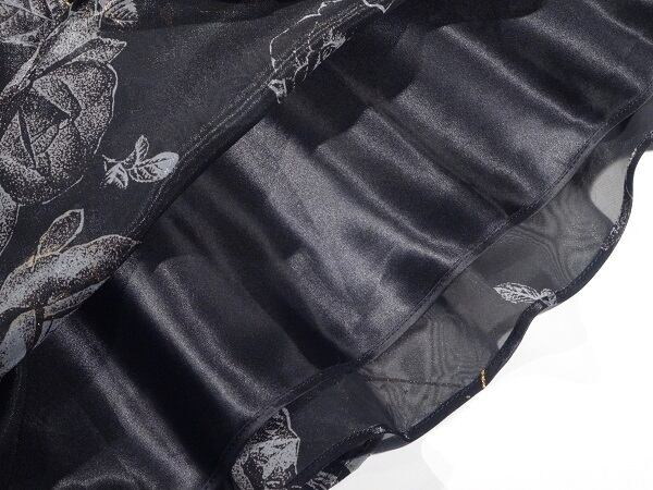 黒地に金糸刺繍薔薇プリントサテンのワンピース。艶やかな黒のサテン地に、グレーで薔薇をプリント。ところどころ、金糸で花の形を縁取り華やかに。背中はウエスト上から首もとまで紐で編み上げるセクシーでフェミニンなデザイン。シックで上品な女性を表現してくれています。パーティやイベント、コンサート、結婚式にと、さまざまシーンで活躍してくれる美しい一着。胸パッド付。左脇下ファスナー。裏地付。