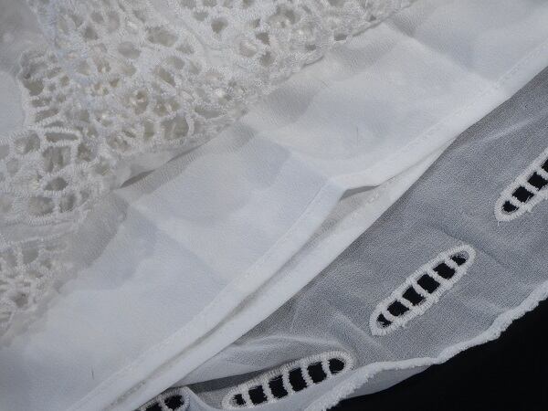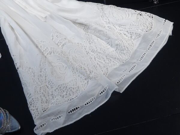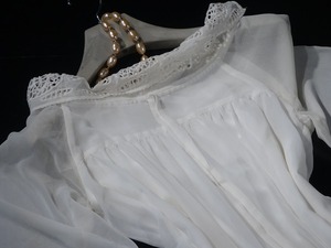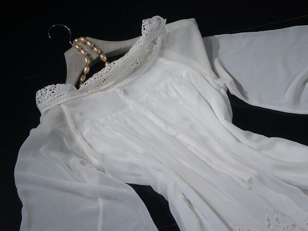 透かしレースと大きなフリルの袖のワンピース。やわらかなオフホワイトのシフォン地をたっぷりと使用。襟元と裾は繊細な透かしレースを施し、襟ぐりはシフォンの共布紐リボンを結ぶフェミニンなデザイン。フリル仕様の袖は華やかで気になる二の腕をしっかりカバー。ほんのりとした透け感が上品な女性を表現してくれています。パーティやイベント、コンサート、結婚式にと、さまざまシーンで活躍してくれる美しい一着。ファスナーなしのかぶるタイプ。裏地付。