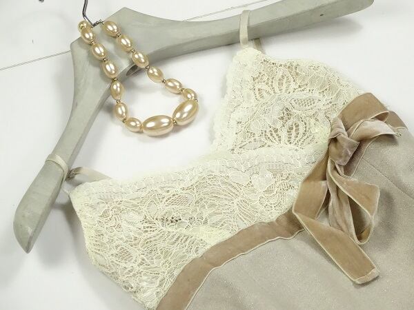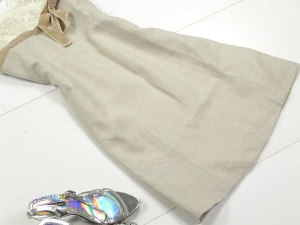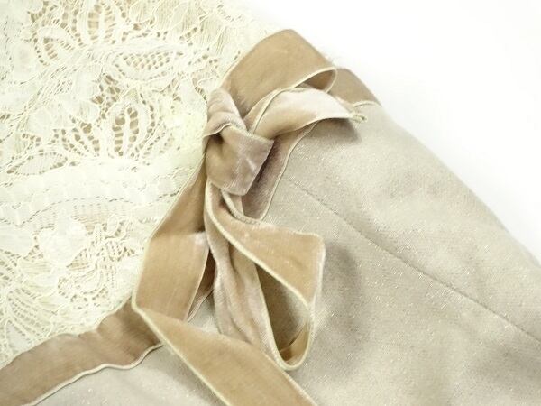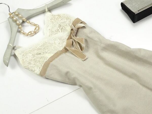 胸元レースベルベットリボンが可愛いワンピース。シックなベージュブラウンのツイードタイプの生地に、胸元はレース仕様。切替部分のベルベットのリボンがキュートでフェミニンなデザインになっています。パーティやイベント、コンサート、結婚式にと、さまざまシーンで活躍してくれる美しい一着。肩紐調整可能。左脇下ファスナー。裏地付。