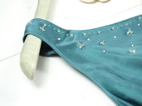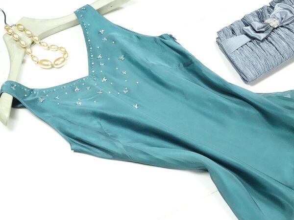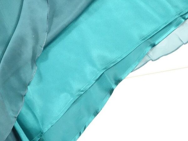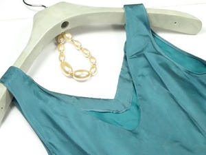 シフォンのとても軽いフォ-マルパーティ-ドレスです。パステル系グリ-ン色の生地でとても綺麗なドレスです。裏地付。左脇下ファスナ-有。