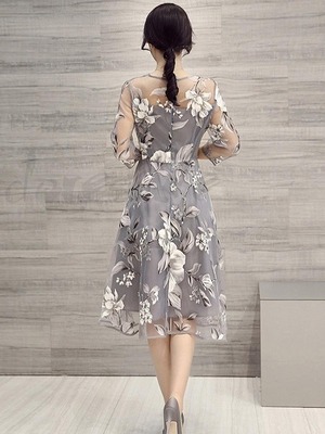 シックなオーガンジーのワンピース。落ち着いたグレーの地にモノトーンの花模様がバランスよくプリントされています。デコルテライン、袖のほんのり肌見せ透け感がエレガントで魅力的な一着です。結婚式や謝恩会などに。背中ファスナー有。裏地あり。