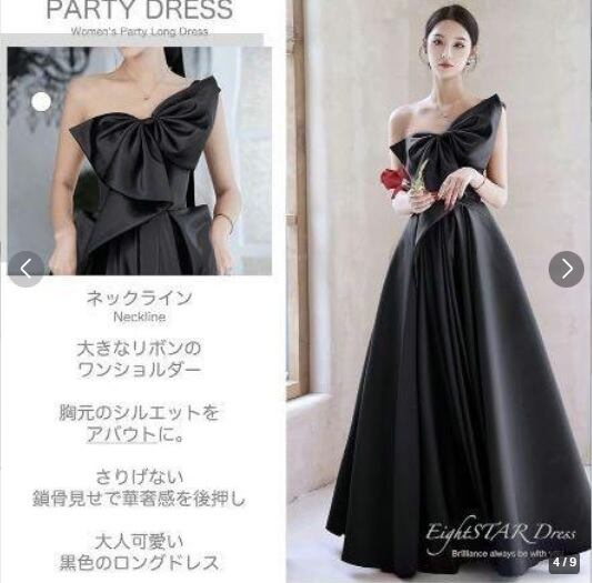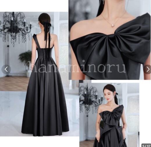 ワンショルダーリボンのロングドレス。たっぷりとした黒のサテン地を使用したデザイン性のあるスタイルがとても魅力的。胸元からウエストにかけてあしらった大きなリボンが豪華かつ上品で全体的に優しい感じに仕上げています。背中はプリンセス使用の編み紐掛け。編み紐の結び具合でバストとウエストサイズを調整できます。結婚式、パーティ、コンサートにと、華やかなシーンに最適な一着です。裏地付。背中編み紐掛け。ファスナーなし。胸パッド付。