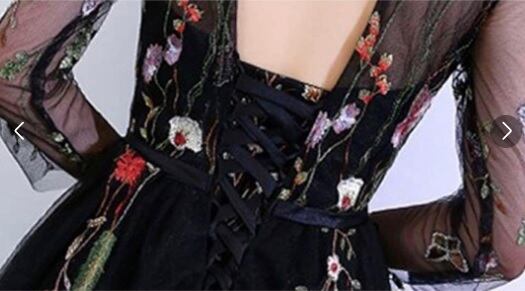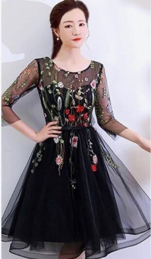 花刺繍膝上チュ-ルパ-ティ-ドレスです。黒のサテン地の上に、黒の花刺繍をほどこしたチュ-ルが重ねられた豪華でフェミニンなデザイン。デコルテラインから肩にかけての透け感が大人の雰囲気を醸し出し、シックで上品な女性を表現。パーティやイベント、コンサート、結婚式にと、さまざまシーンで活躍してくれる美しい一着。背中網掛け。腰下ファスナー有。胸パット付。裏地有。