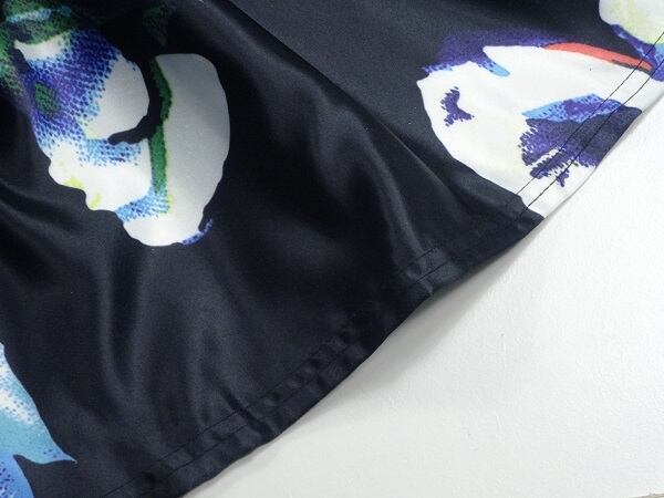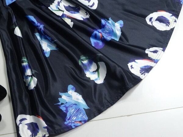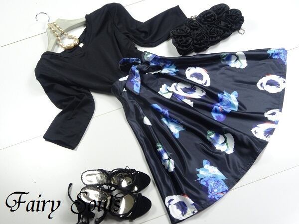 ジャージ素材花柄フレアワンピース。トップス部分は、伸縮性のある黒のジャージ素材。スカート部分はつややかなサテン地に青、赤、白でPOPな花柄をプリント。ウエストシフォン地の上にトップス部分と同じアイボリーのネットチュールをかぶせた大変豪華でフェミニンなデザインになっています。ほんのりとした透け感が上品な女性を表現してくれています。パーティやイベント、コンサート、結婚式にと、さまざまシーンで活躍してくれる美しい一着。一般のサイズより1サイズ位細めです。共布ウエス路リボンベルト付。右脇下ファスナー。裏地付。