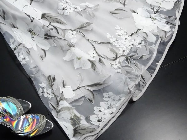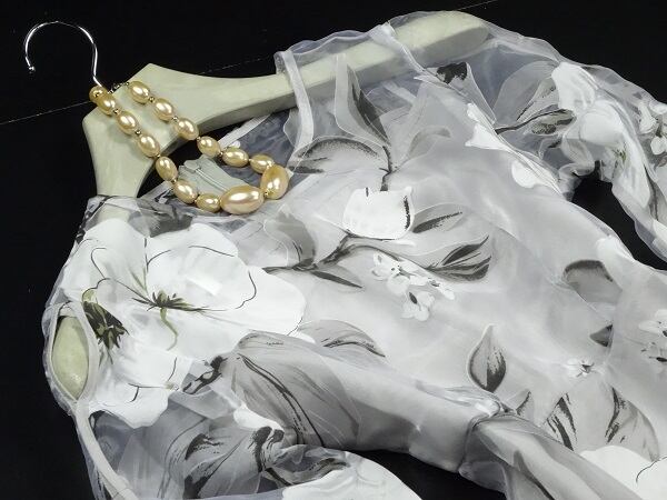 シックなオーガンジーのワンピース。落ち着いたグレーの地にモノトーンの花模様がバランスよくプリントされています。デコルテライン、袖のほんのり肌見せ透け感がエレガントで魅力的な一着です。結婚式や謝恩会などに。背中ファスナー有。裏地あり。