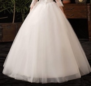 ハイネックプリンセスウエディングドレスです。トップス部分は刺繍がほどこされ、縦襟のフォーマルさと、背中の大胆な空き具合のコントラストがかえってエレガントで豪華です。胸元からウエスト下にかけて綺麗なAラインに広がり豪華かつエレガントな雰囲気を醸し出しています。ウエディングドレスとしても、また、パーティやイベント、結婚式など、様々なシーンで、気品のある印象を与えてくれる一枚です。裏地付き。背中腰から下ファスナ-有。(背中編上げで結び紐有り)。胸パット付。背中編上げなので2~3cmのバストサイズの幅は結び具合により大丈夫です。