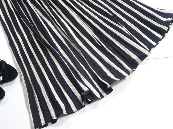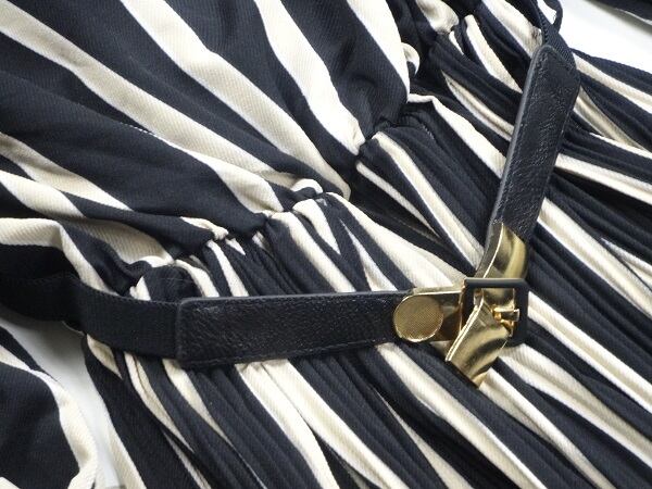 5分袖プリ-ツマキシ丈ワンピ-スです。黒とベージュのグラデ-ションがとても綺麗で動くたびに揺れる裾が女性度UP!!背中ファスナー有。裏地なし。ベルト付き。
