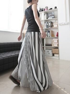 大人テイストのストライプ柄ふんわりシフォンマキシ丈スカートです。ウエストはゴム仕様ですので長時間でも楽に着て頂けます。裏地付ですが、透け感がありますので、インナー着用をお勧めします。