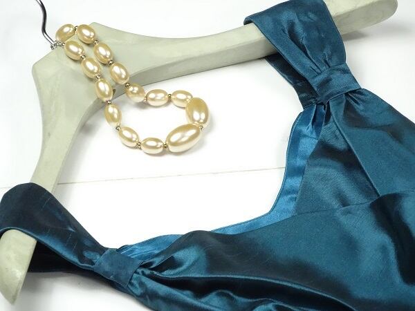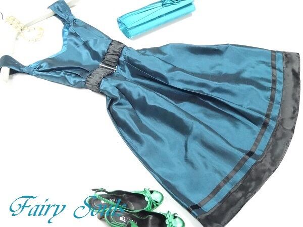 高級シャンタン素材の上品かつフェミニンなデザインのビリジアン色のパ-ティ-ドレスワンピです。パーティやイベント、コンサート、結婚式にと、さまざまシーンで活躍してくれる美しい一着。ベルト付。右脇下ファスナーあり。裏地あり。