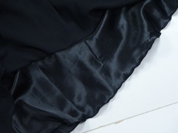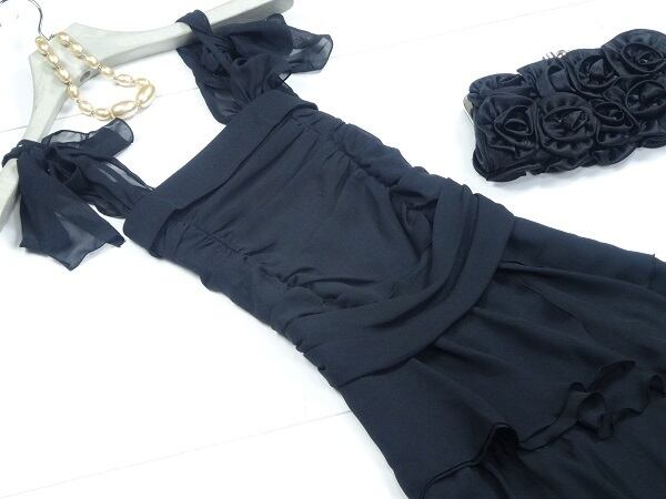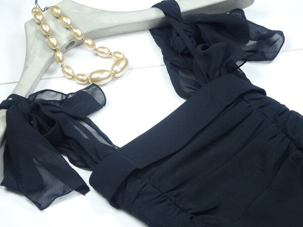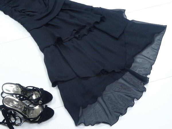 肩紐リボン黒のフリルシフォンのドレスワンピース。肩紐の上に、シフォンのリボンを結ぶデザイン。左右分けて結んでも、また首の後ろに回してホルターネックとしても楽しんで頂けます。胸元は横にゆったりとドレープをとり、スカート部分はアンシンメトリーなフリルを何段かに重ねて変化を持たせ、裾をランダムにすることで動きを作り出しています。パーティやイベント、結婚式など、様々なシーンで、気品のある印象を与えてくれる一枚です。背中ファスナー。裏地有。