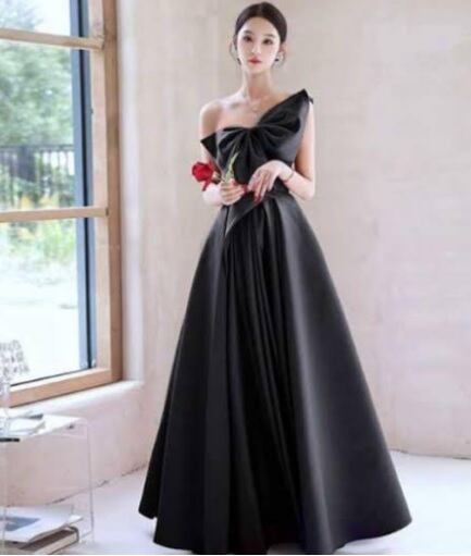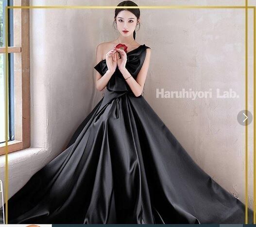 ワンショルダーリボンのロングドレス。たっぷりとした黒のサテン地を使用したデザイン性のあるスタイルがとても魅力的。胸元からウエストにかけてあしらった大きなリボンが豪華かつ上品で全体的に優しい感じに仕上げています。背中はプリンセス使用の編み紐掛け。編み紐の結び具合でバストとウエストサイズを調整できます。結婚式、パーティ、コンサートにと、華やかなシーンに最適な一着です。裏地付。背中編み紐掛け。ファスナーなし。胸パッド付。