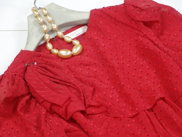 マグ-フリルモチ-フワンピ-スです。胸元部分はフリルになっていて全体的に柔らかい生地がつかわれているのでとても上品です。背中ファスナー。裏地付。