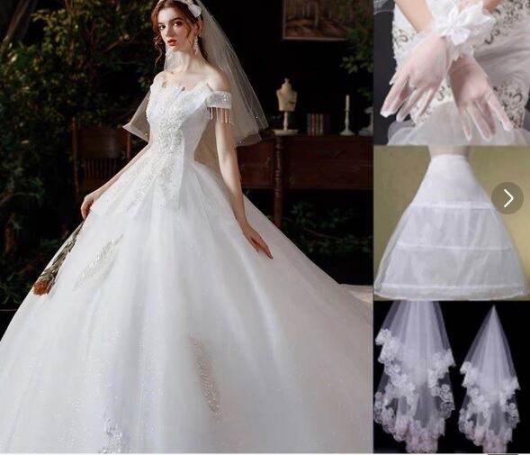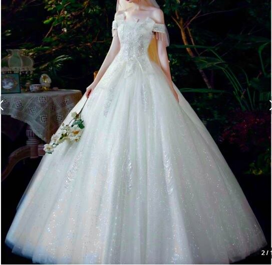 オフショルダーウエディングドレス。トップス部分はデコルテラインを美しく魅せるオフショルダーで胸元の装飾がとても豪華です。背中は腰まで編み紐掛けになっていて、紐の締め具合でバストサイズを調整できます。腰から下はファスナーになっているので着脱がしやすくなっています。デザイン性があり、豪華かつエレガントな雰囲気を醸し出しています。ウエディングドレスはもちろん、パーティやイベント、結婚式など、様々なシーンで、気品のある印象を与えてくれる一枚です。裏地あり。背中編み紐掛け。腰下ファスナーあり。胸パット付。パニエ・グロ-ブ・ベールもついています。
