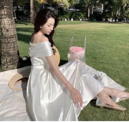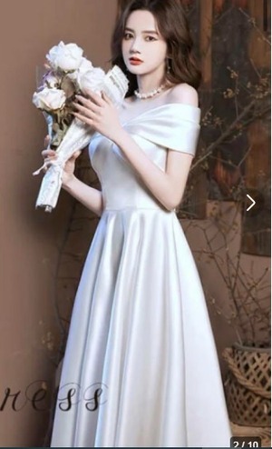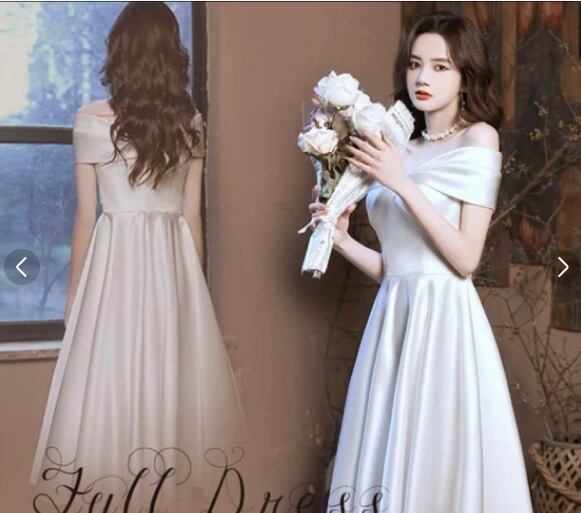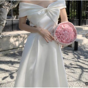 サテンオフショルダーパ-ティ-ドレスです。胸元の大きなリボンとデコルテから肩にかけてのラインが美しくみえるデザインです。パーティやイベント、結婚式など、様々なシーンで、気品のある印象を与えてくれる一枚です。背中ファスナ-有。裏地有。胸パット付き。