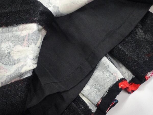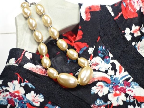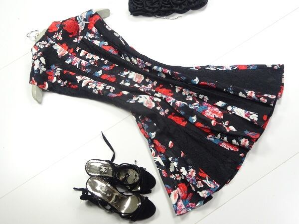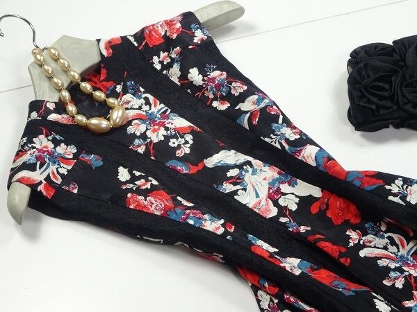 黒をベ-スにしたノ-スリ-ブワンピ-スに鮮やかな花柄が施されレ-スの切替を加えた上品な印象のワンピ-スです。首元からウエストにかけては細身のシルエット、スカ-ト部分で一気にふわ-とフレア-に。裏地付。背中ファスナ-有。