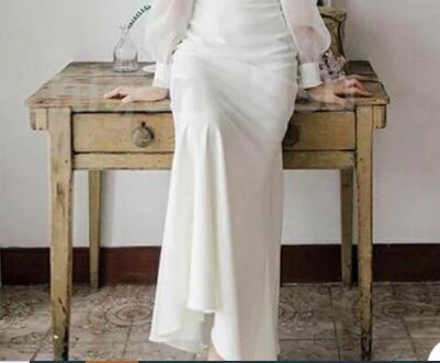 伸縮性のある白の長袖ワンピース。白が綺麗なジャージ素材の生地を使用。胸元V字カットのおしゃれでユニークなデザイン。透け感のある長袖がエレガントな、ちょっとおしゃれな普段着からフォーマルなシーンにも活躍してくれる一着です。背中ファスナー。裏地なし。胸パッド付。