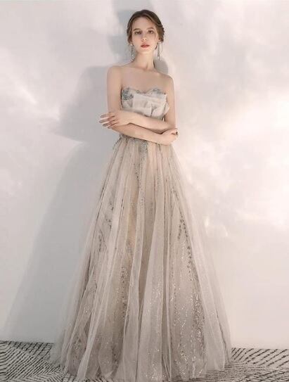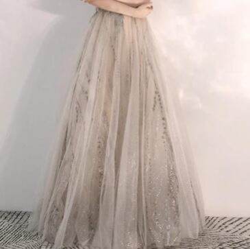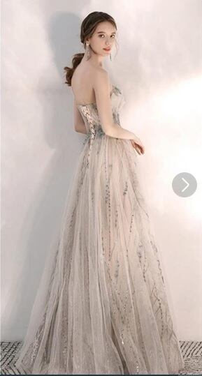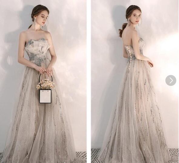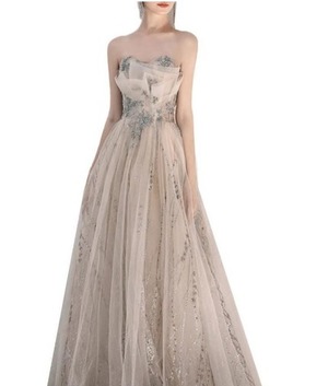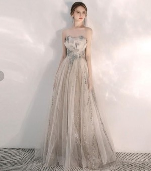 ラメとスパンコール飾りが美しいベアタイプのパーティードレス。シャンパンゴールド色のサテン地の上にスパンコールとラメを配したチュールを重ねています。ベアタイプの胸元はチュールを縦に何層かタックを取り、ウエストまで銀糸の刺繍にスパンコールで豪華さをアップさせています。肩ひもなしのベアタイプですが、背中編み紐掛け仕様なので、紐の締め具合でしっかりとドレスの滑りを防いでくれます。パーティやイベント、結婚式など、様々なシーンで、気品のある印象を与えてくれる一枚です。裏地なし(サテン地の上にチュールをかぶせています)背中は腰下まで編み紐掛け。ファスナ-なし。胸パット付。