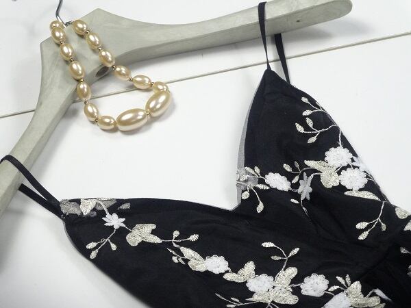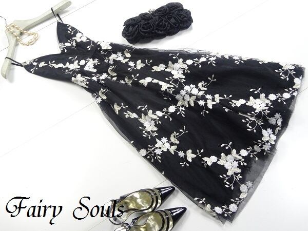ブラックカラ-にゴ-ルドの刺繍がとても素敵なドレスワンピ-スです。右脇下ファスナー有。裏地付。