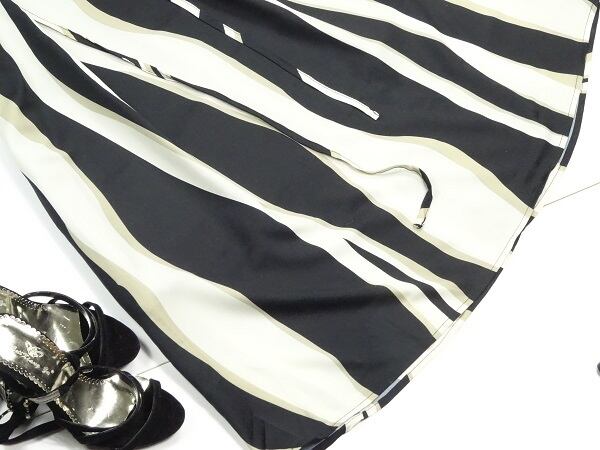変則ストライプ前ボタン留めロング丈のワンピース。やわらかなシフォン地に、黒、シャンパンゴールド、白で波のようなストライプをプリント。スタンドカラーに、前ウエストまでをボタン留め。シックで上品な女性を表現してくれています。パーティやイベント、コンサート、結婚式にと、さまざまシーンで活躍してくれる大人の一着。脇下ファスナー。スカート部分裏地付。