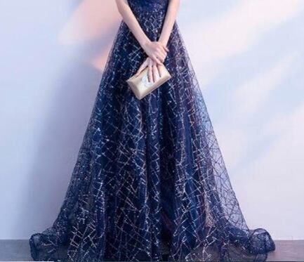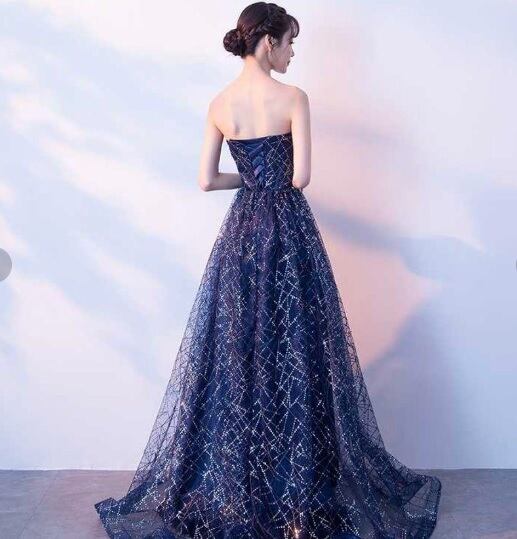 スパンコール飾りが美しいフィッシュテールタイプのロングドレス。たっぷりとした紺のサテン地の上に、スパンコールを張り巡らした紺のチュールをたっぷりと重ねたデザイン性のあるスタイルがとても魅力的です。肩紐のないベアタイプの胸元はしっかりとした固めのチュールを使用し、ずり落ちをカバー。豪華かつ上品で全体的に優しい感じに仕上げています。背中はウエストまでは編紐で縛るタイプなので、紐の締め具合でバストサイズを調整できます。ウエストから下はファスナー仕様になっています。後ろが前よりも長いフィッシュテールデザイン。シックでゴージャス。華やかなパーティシーンにぴったりの一着です。背中編み紐掛け。腰から下ファスナー仕様。胸パット付き。