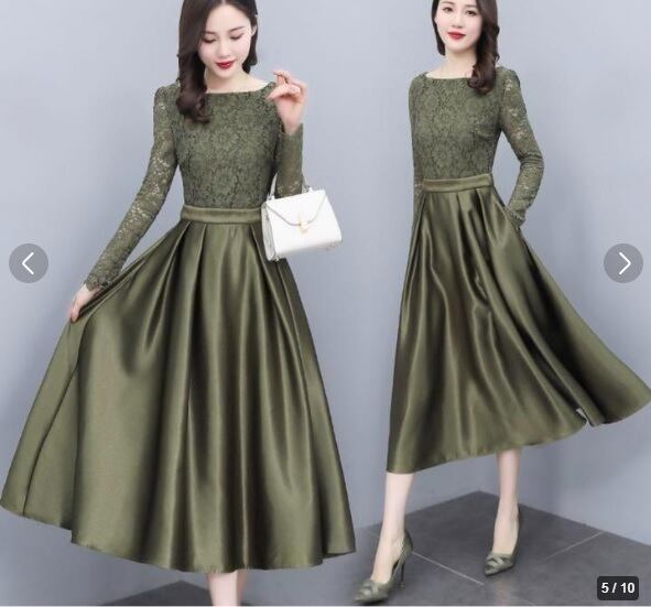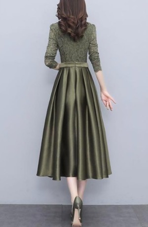 シックなレースとサテンのワンピース。トップスと袖にはレースをあしらい、胸元はすっきりとした浅いU字ライン。袖先は平ではなくレースの模様を生かしたカットになっています。ウエストから裾にかけては光沢のあるサテン地を使い、気品に満ちたとてもエレガントで上品なひとクラス上をいく一品に仕上げています。