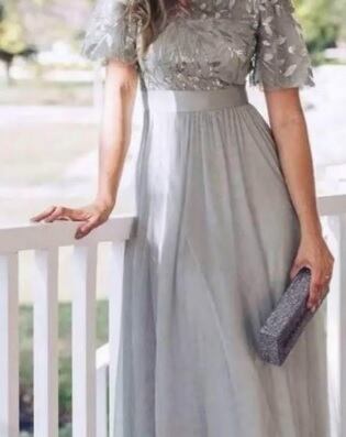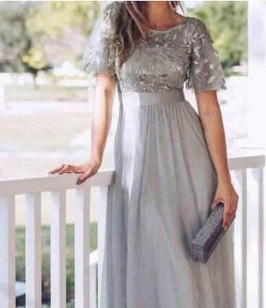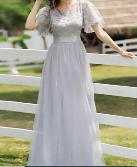 スパンコール刺繍とチュ-ルのドレス。トップス部分前後のスパンコールと光沢のある銀糸の刺繍がシックで華やかな印象に。胸元と袖の透け感がデコルテラインと二の腕を綺麗に見せてくれていてセレブリティ-な雰囲気で、ウエストの切り替えからチュ-ル素材が大きく広がるスカート部分のボリューム感が魅力的なデザイン。結婚式の二次会、コンサート、パーティなど、華やかなシーンに最適な一着です。裏地あり。背中ファスナ-有。