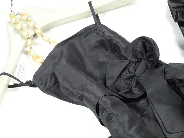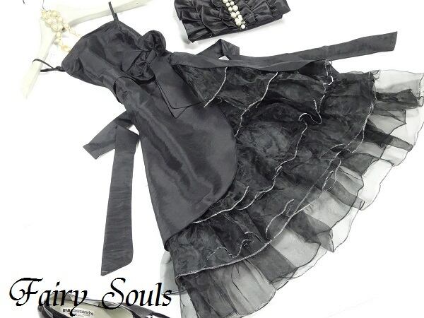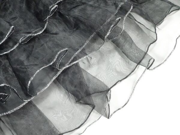 艶やかなサテンとオーガンジーが豪華なミニドレス。ウエストリボンの下から裾にかけてサテン生地がカットされ、たっぷりとしたフレアのオーガンジーが華やかな印象を与えています。伸縮性なし。右サイドファスナ-有。裏地有。