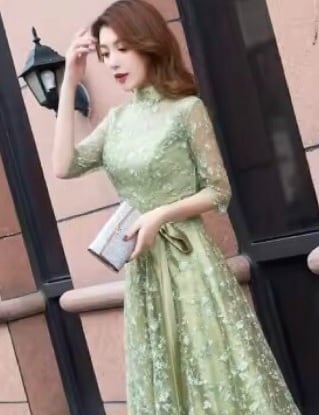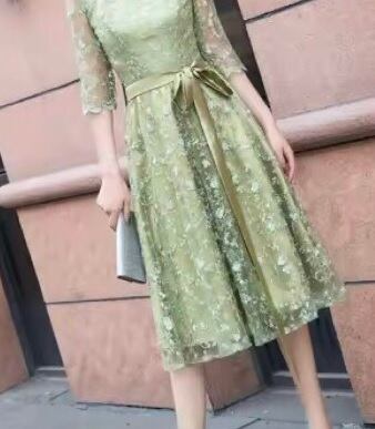 七分袖シックな花柄刺繍のワンピース。フレアが綺麗なAラインのシルエット。綺麗な抹茶系の下地の上に、同色糸で刺繍をほどこしたチュールをかぶせたフェミニンなデザインになっています。ウエストの同色サテンのリボンベルトがアクセントに。シックで上品な女性を表現。パーティやイベント、コンサート、結婚式にと、さまざまシーンで活躍してくれる美しい一着。背中ファスナー。裏地付。リボンベルト付き。