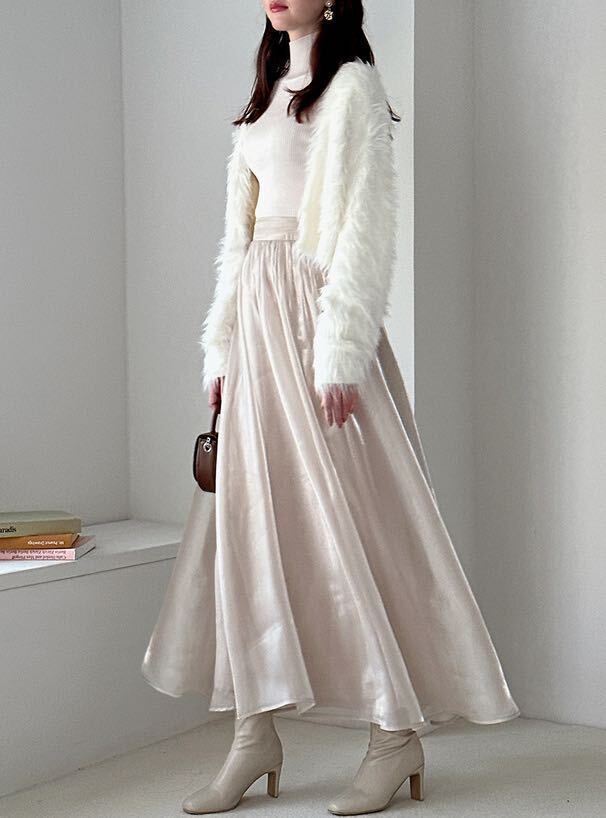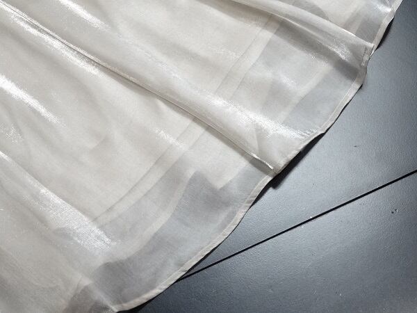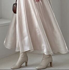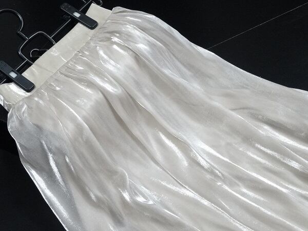 光沢シフォンロング丈フレア-スカ-ト。光沢のある薄めのゴールドブラウン色の生地をたっぷりと使用。軽くて、歩くたびにふんわりと揺れる魅力的なシルエット。リゾートコーデにも最適です! 裏地付。ファスナーなし。ウエストは後ろ側がゴム仕様で伸縮性があります。