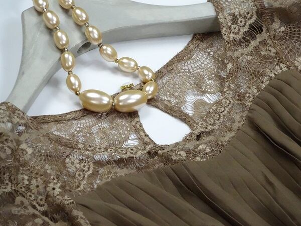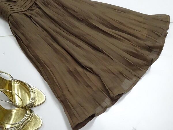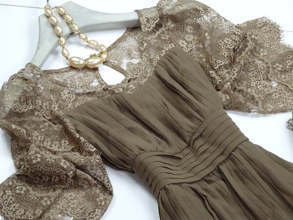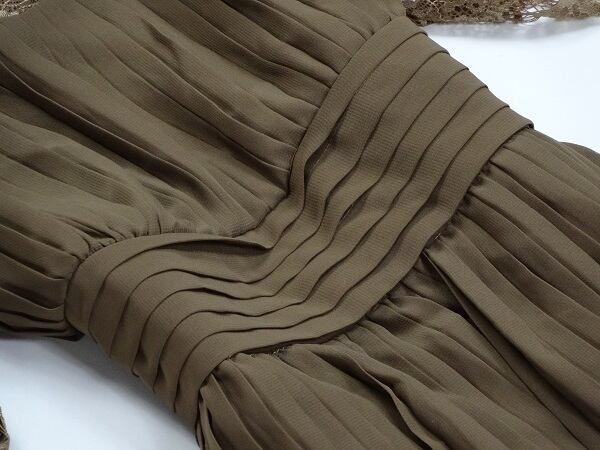 七分袖プリ-ツワンピ-スです。全体のプリ-ツと袖・胸元のレ-スがとてもお洒落でデザイン性のあるスタイルがとても魅力的な一着です。可愛いデザインで全体的に優しい感じに仕上げられています。裏地あり。左脇下ファスナ-有。
