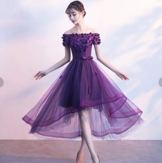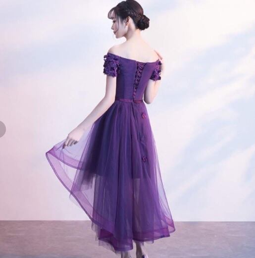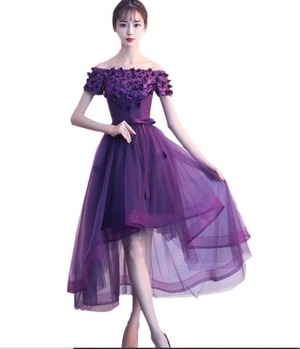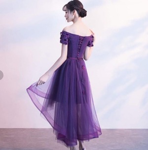 フィッシュテ-ルのパ-ティ-ドレス。深いパープルのサテン地に同色のチュールをかぶせ、胸元と袖にはパープルのレース刺繍にかわいい花のモチーフをあしらっています。前と後ろで裾の長さが違うフィッシュテール型。デコルテラインと肩が美しく見えるオフショルダータイプ。キュートさの中にもセクシーさをあわせもった魅力的なデザインになっています。背中が編み紐掛けになっているので、紐の締め具合でサイズ調整が可能。エレガントで、パーティやイベント、結婚式など、様々なシーンで、気品のある印象を与えてくれる一枚です。裏地あり。背中編紐掛け。腰から下ファスナー有。胸パット付き。