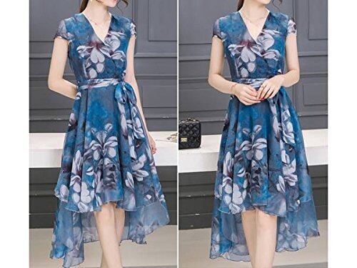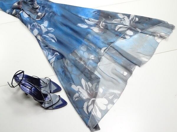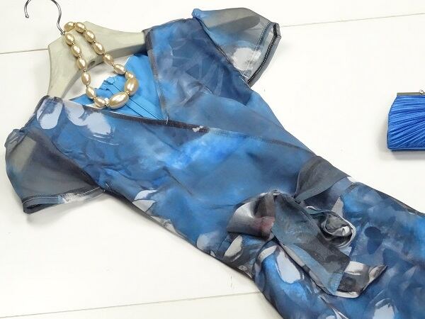 大きな花模様がプリントされたシックなワンピース。裾の後部分が長くなっている不規則な丈の品の良いセクシー感をかもしだしているエレガントな一着です。ウエストを共布のベルトリボンでキュッと絞るデザイン。シックでやさしくエレガントな一着です。裏地有り。背中ファスナー有。布ベルト付。