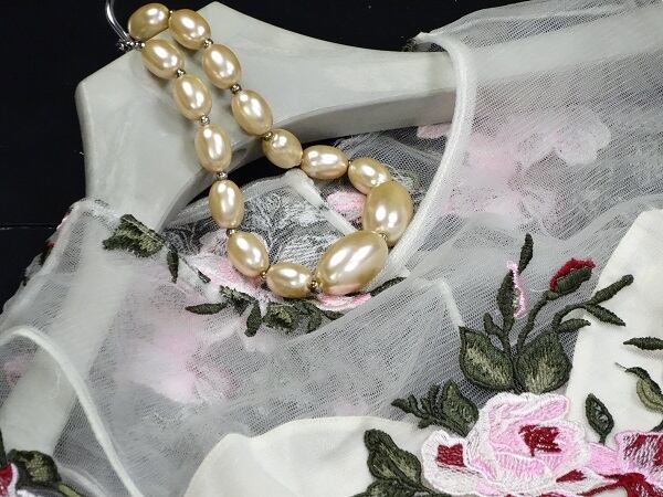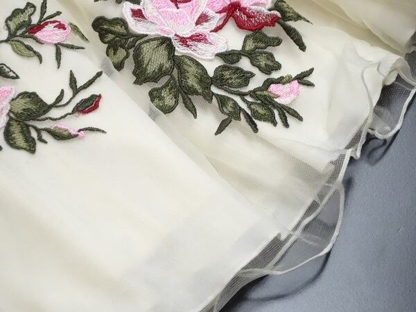 非常に手の込んだ刺繍がとても素敵で品のあるピュアでフェアリーなデザインになってるワンピ-スです。煌めく太陽の光の中でも、また新緑の爽やかな風の中でも、着る人を美しく魅せてくれる一着です。裏地有り。左脇下ファスナー有。