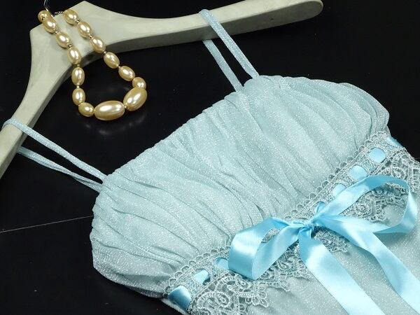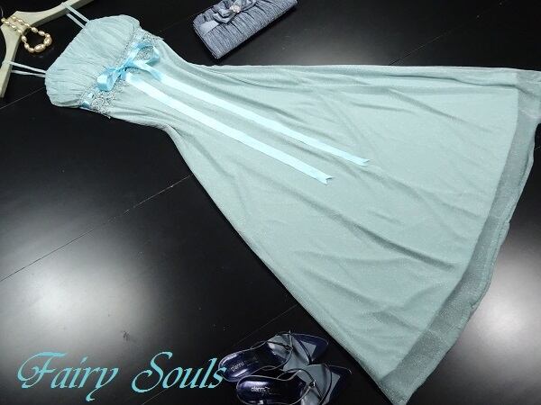 シルバ-ラメフォ-マルパ-ティ-ドレスです。パステル系水色の生地み銀ラメがとても綺麗なドレスです。裏地付。ファスナ-なし(かぶるタイプ)。