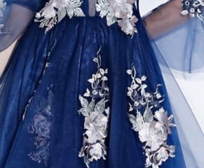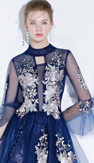 全体的に花の立体刺繍が施された可愛いフィッシュテ-ルパ-ティ-ドレスです。サテン地にチュ-ルが重ねられ、ウエストからスカート裾までのとても綺麗なシルエットが揺れるごとに着る人の足元を美しく見せてくれる豪華なドレスです。パーティやライブ、イベント、結婚式など、どんなシーンでも活躍してくれる一着です。背中ファスナー有。胸パット付。