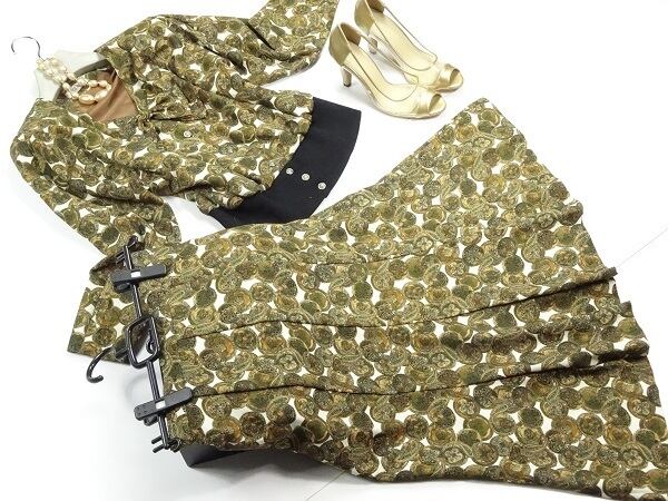 ドルマン袖ジャケットとスカートのセット。落ち着いた色合いでトップスは前ボタンになっています。ウエスト部分は伸縮性がありサイズ的にゆとりを持って着用頂けます。上品で優しい大人の女性を表現してくれる一着です 。スカートは後ファスナー。裏地有り。