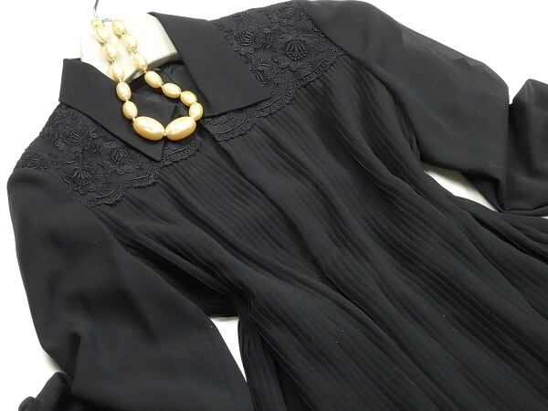レースとプリーツ仕様ブラウスとワンピースのセット。ブラウスはフォーマルな襟に胸元にはレース。繊細なプリーツとふんわりシフォンの袖がエレガント。ワンピースはウエストからすそにかけて細かなプリーツ仕立てで上品な女性を演出してくれてます。ワンピースは背中ファスナ-。裏地付。