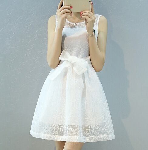 全体的に白地の上から白の可愛らしい花模様が刺繍されているオーガンジ-素材が被さりとても素敵な膝丈ワンピ-スです。胸元の透け感がキュートでちょっとセクシーな魅力的なデザインです。右サイドファスナー有。裏地あり。