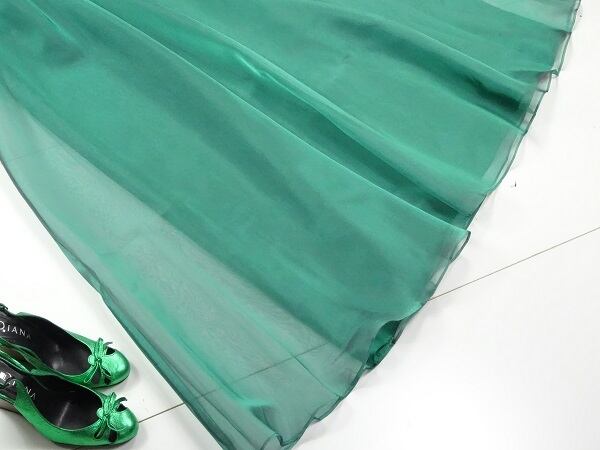 ステージフレアロング丈オーガンジーのスカート。艶やかなサテン地の上にオーガンジーをかぶせた華やかな一着。歩く度にふんわりと揺れる裾が視線を集めます。後ろファスナー。裏地付。