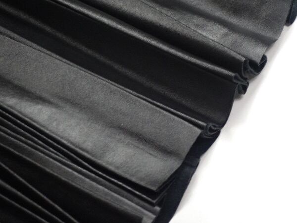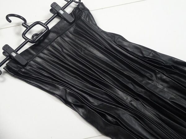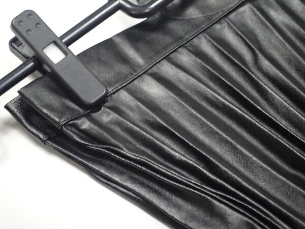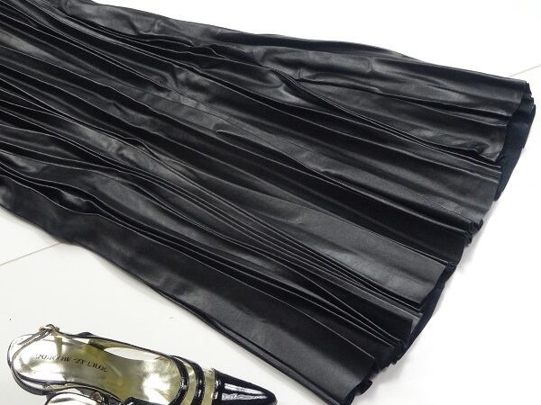 フェイクレザーミモレ丈プリ-ツスカートです。甘めなプリ-ツもレザ-調ならではのものです。サイドファスナー。裏地付。