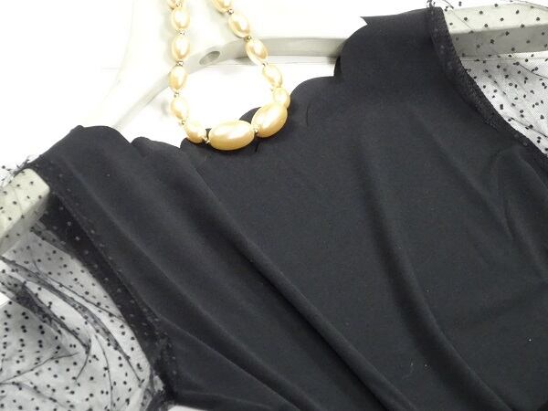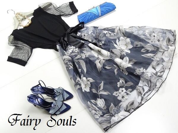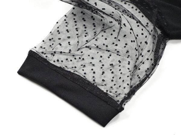 ブラウスと花模様のスカートのセット。ブラウスの身頃部分は柔らかな黒のジャージ素材。袖は透け感のあるオーガンジーに小さなドット柄をプリント。いくつかの丸みのある襟ぐりがキュートさをプラスしています。スカートはオーガンジーの上地にシックな花模様をプリント。ウエストの黒のサテンのリボンがアクセントに。ピュアでエレガントな印象の一着です。ファスナーなし。スカートはウエスト総ゴム仕様で伸縮性があります。裏地有。