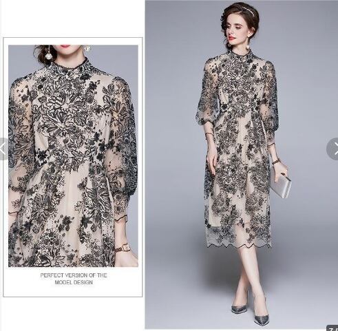 ボタニカル刺繍のミモレ丈のワンピ-ス。ベージュの下地の上に、黒糸でボタニカル刺繍を全体にほどこしたチュールを重ねています。襟は立て襟でフォーマルに。袖はふっくらとした袖先にタイトな袖口を繋ぎフェミニンな印象を醸し出しています。パーティや結婚式の二次会、デートにと様々なシーンで活躍してくれる一着です。裏地あり。背中ファスナ-。