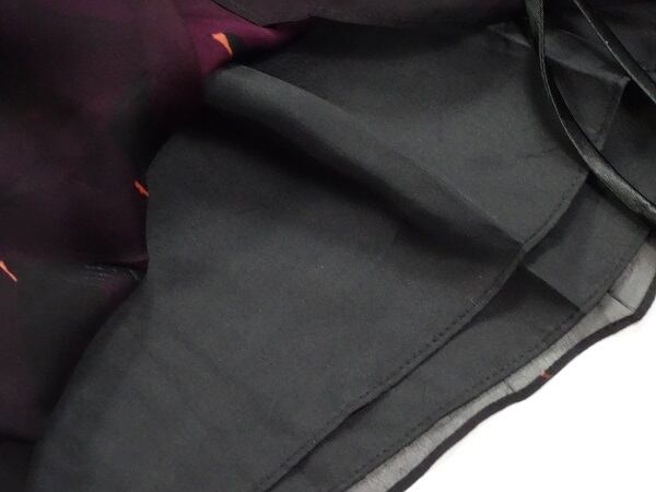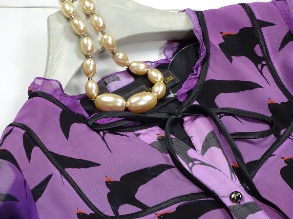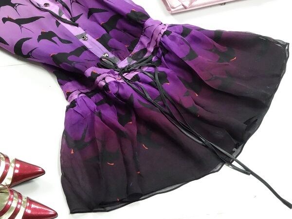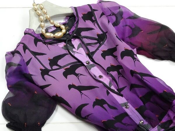 シックなパープルカラーの生地全体にプリントされたツバメの柄がとってもユニークなシルク100%のワンピースです。小さなフリルがついた襟元と、ウエスト部分には黒の紐リボンがあしらわれ、袖は先が少しすぼんだ可愛いチューリップラインになっています。袖口とスカートの裾部分は紫から灰紫へと続くグラデーションになっていて、可愛らしさと品の良さが程よくあわさった素敵なデザインです。裏地付。