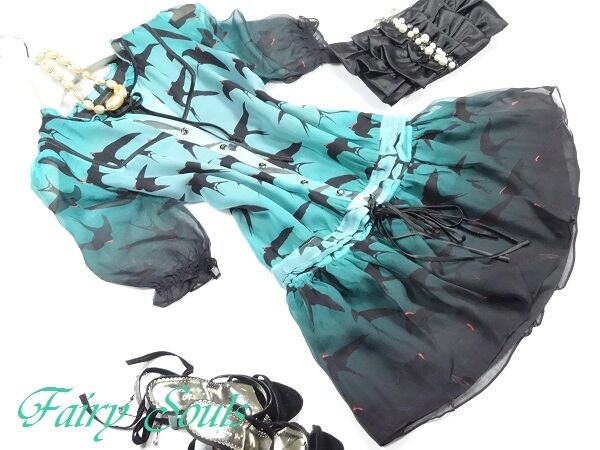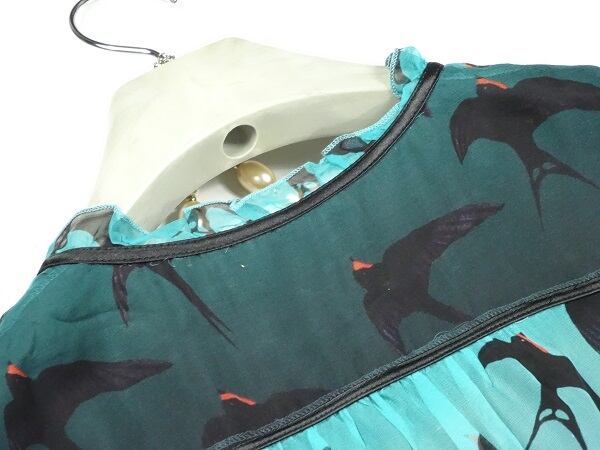 シックなグリ-ンカラーの生地全体にプリントされたツバメの柄がとってもユニークなシルク100%のワンピースです。小さなフリルがついた襟元と、ウエスト部分には黒の紐リボンがあしらわれ、袖は先が少しすぼんだ可愛いチューリップラインになっています。袖口とスカートの裾部分は緑から黒へと続くグラデーションになっていて、可愛らしさと品の良さが程よくあわさった素敵なデザインです。裏地付。