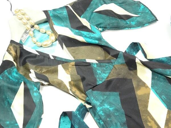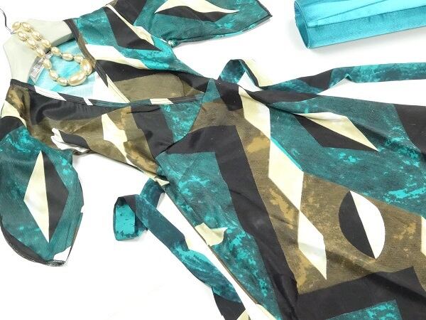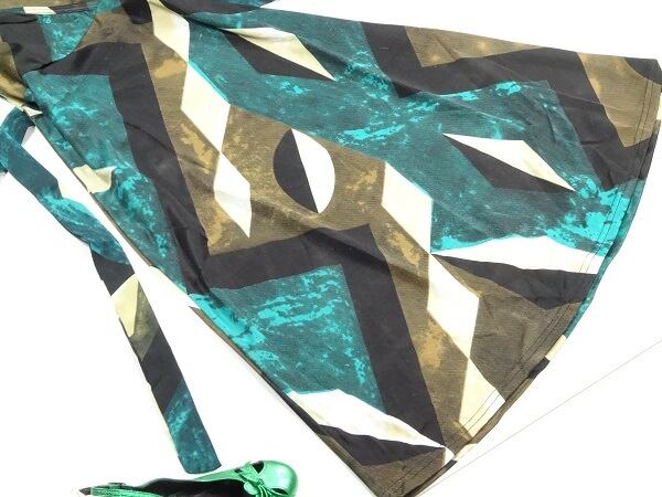腕見せV字カット大人のワンピース。落ち着いたグリーン系の色合いに幾何学模様をプリントしたしなやかで薄手のベルベット風な素材。胸元はV字カットで大人の魅力を表現。袖はひじ丈で、肩か袖先にかけて2,3か所を縫い留めただけのデザイン。腕を動かすたびに肌がちらちらと見えて品の良いセクシーさを醸し出しています。ウエストは共布のリボンベルトでアクセントをつけています。やさしい印象の一着です。共布ウエストリボンベルト付。背中ファスナー。裏地なし。