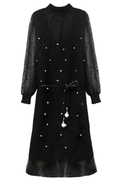 総レースキャミワンピースと長袖チュニックのセット。黒の総レース仕様。ワンピースは身頃にフェイクパールを配したキュートな幅広キャミタイプ。チュニックは襟元がゴム仕様できゅっと絞った形になり、袖は下の肌がほんのり透けて見えます。どこをとっても飽きの来ない工夫を凝らしたかわいらしいデザインで全体的に優しい感じの仕上がりです。合成皮革のリボンベルト付。ワンピースは裏地なし。チュニックのみ裏地付。