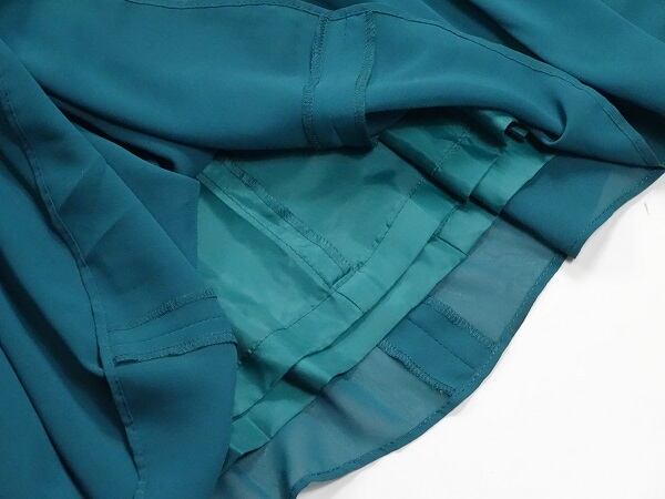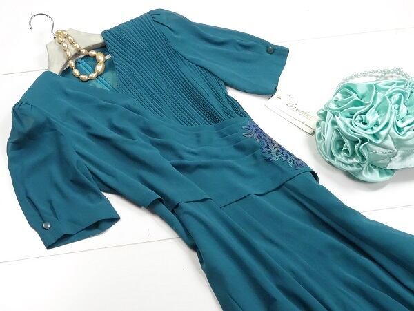落ちついたグリーンに繊細なドレープとプリーツが優雅なワンピース。カシュクール風の胸元は、右側がやさしいドレープ。左側が繊細なプリーツと変化があり、左ウエストにはポイントに花刺繍が施されています。スカート部分はしなやかな生地をたっぷりと使用し、エレガントで優しい大人の女性を表現しています。パールや二重、三重のチェーンアクセで、結婚式やコンサート、パーティなどフォーマルなシーンにもぴったりな一着です。 裏地有り。