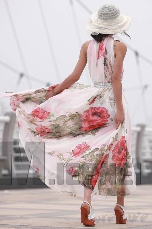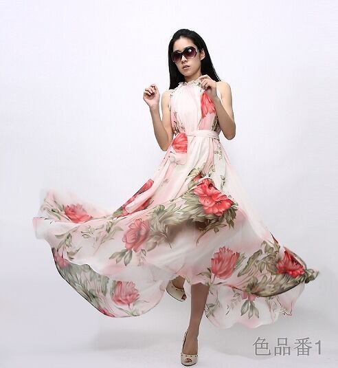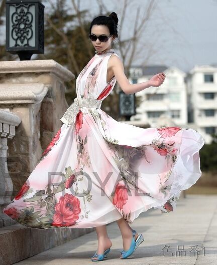 華やかで上品な花シフォンマキシ丈ワンピースです。全体に大きな花柄がプリントされたしなやかでやわらかな生地がたっぷりと使われています。裾は十分な生地を使用していますので、歩くたびになびき足の動きをキレイに見せてくれます。裏地付。