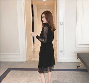 総レースキャミワンピースと長袖チュニックのセット。黒の総レース仕様。ワンピースは身頃にフェイクパールを配したキュートな幅広キャミタイプ。チュニックは襟元がゴム仕様できゅっと絞った形になり、袖は下の肌がほんのり透けて見えます。どこをとっても飽きの来ない工夫を凝らしたかわいらしいデザインで全体的に優しい感じの仕上がりです。合成皮革のリボンベルト付。ワンピースは裏地なし。チュニックのみ裏地付。