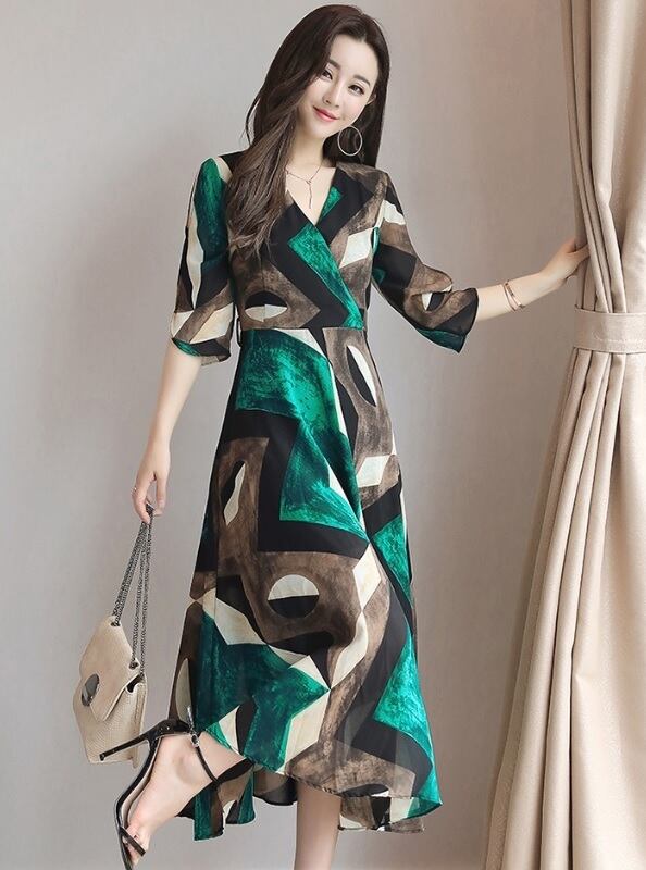 腕見せV字カット大人のワンピース。落ち着いたグリーン系の色合いに幾何学模様をプリントしたしなやかで薄手のベルベット風な素材。胸元はV字カットで大人の魅力を表現。袖はひじ丈で、肩か袖先にかけて2,3か所を縫い留めただけのデザイン。腕を動かすたびに肌がちらちらと見えて品の良いセクシーさを醸し出しています。ウエストは共布のリボンベルトでアクセントをつけています。やさしい印象の一着です。共布ウエストリボンベルト付。背中ファスナー。裏地なし。